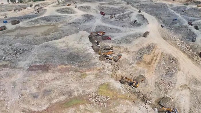前期爆破剥离工序后,徐工20吨挖掘机搭配140的小破碎锤进行二破,同时XE380GK,XE600GK等机型进行挖装作业,现场共投入挖掘机50多台,每天的挖方量在10万方左右 红桃影视免费观看。