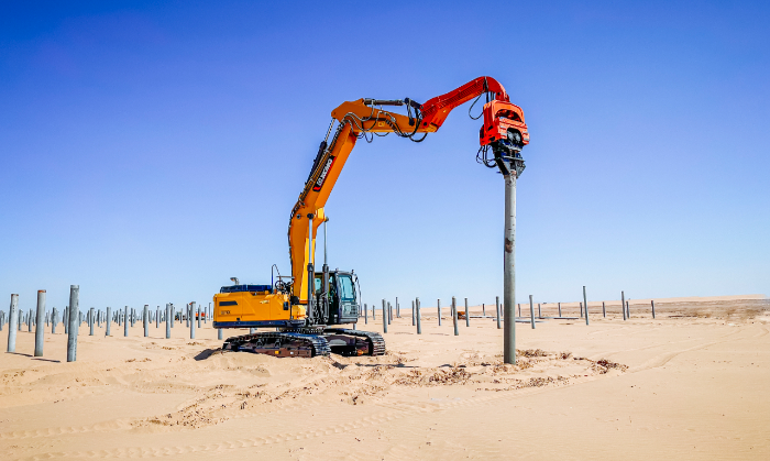 此次徐工挖掘机参建的巴彦淖尔100万千瓦光储+生态治理项目位于内蒙古西部,是自治区年度重点工程,对当地资源开发和绿色发展具有重要意义, 与以往常规项目不同,此次徐工挖掘机主要担任光伏桩的铺设工作 红桃影视,通过改装振动锤和引孔机等多功能属具,有效满足现场多元化施工需求。