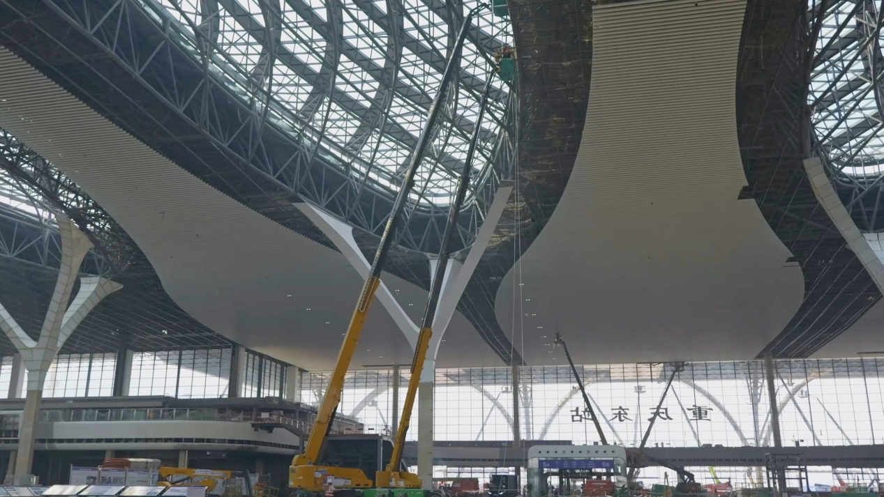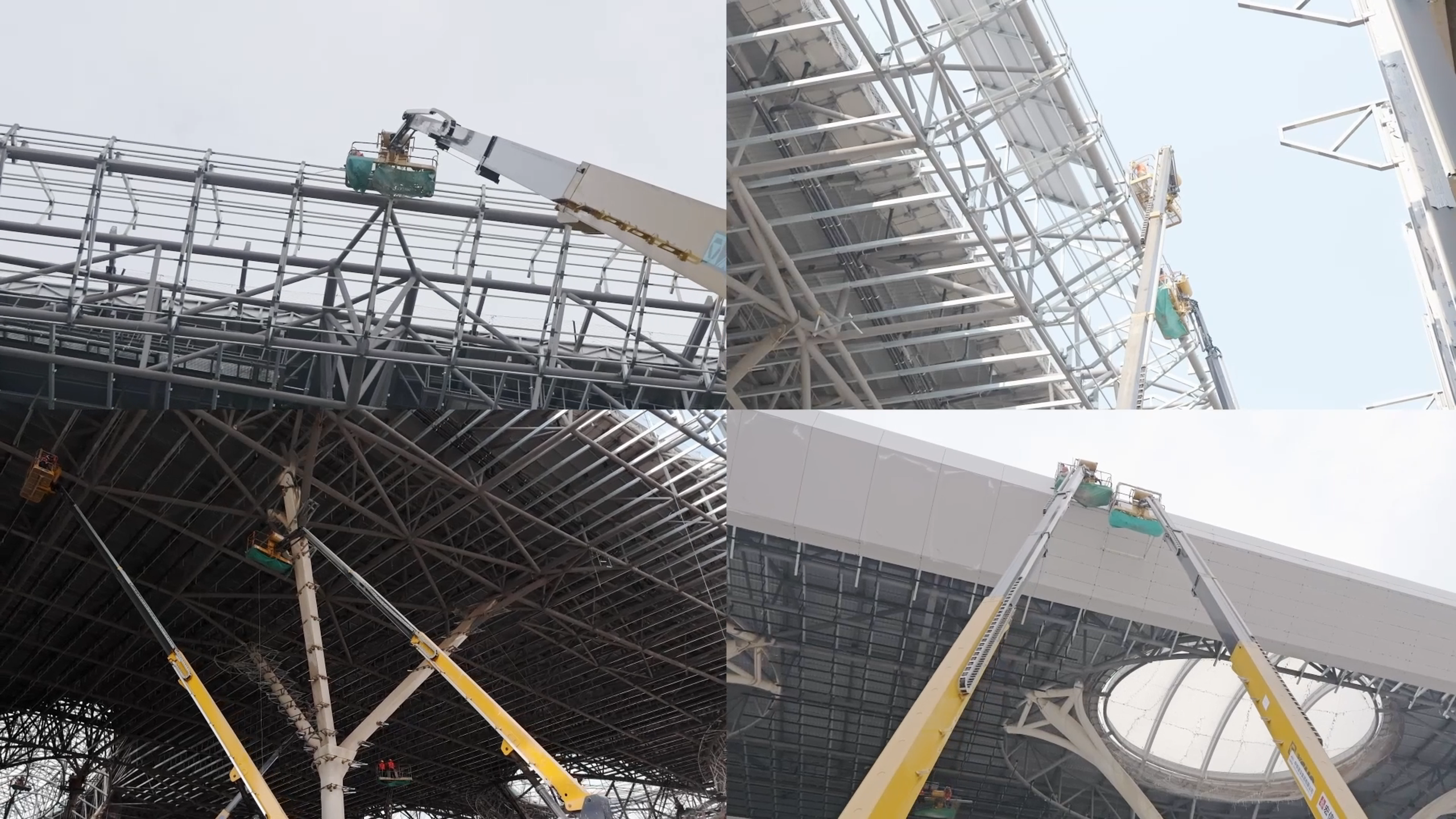 在重庆东站,十数台高空作业平台正在如火如荼的进行钢结构的安装工作,这些高空作业平台作业精准高效,动作平稳灵活 红桃影视,为施工工作节省了大量时间与人力成本。