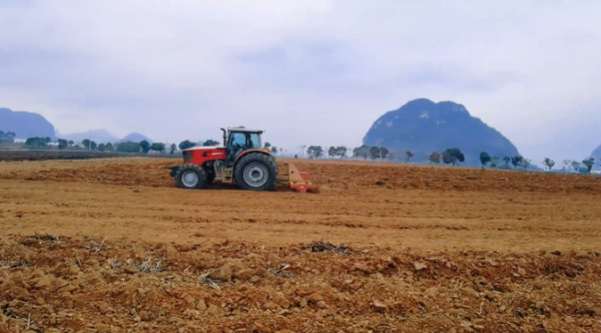 在完成耕深约50厘米的犁地作业后,牵引着3米幅宽的重型旋耕机稳稳驶过蔗田,对25厘米耕作层进行精细化碎土整地,有效改善板结土壤结构。