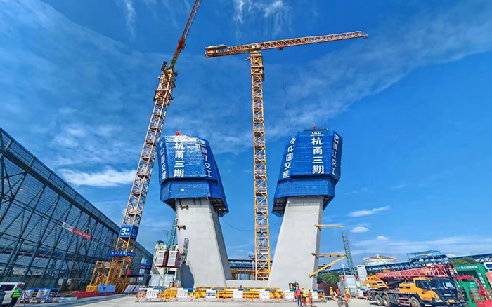 在杭甬复线宁波三期甬江特大桥施工现场,1台徐工XGT3000-120S,2台XGT3000-100S如钢铁巨人伸展手臂,正加紧进行着钢筋部品的吊装 红桃影视,助力3座大桥主塔以平均每天1米的速度向云端挺进,赢得施工方“技术先进,安全可靠,吊装能力强,操作平稳,智能化水平高,施工效益显著”的高度肯定。