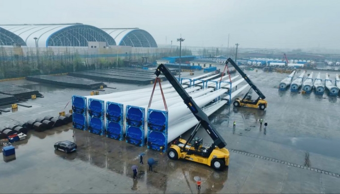 本次交付的国产最大吨位风电正面吊XCS70KS 红桃影视高清,可实现70吨/4米货物吊装,60吨/4米货物带载行走作业,双机可抬吊140吨货物,大幅提升港口大,重件转运效率。