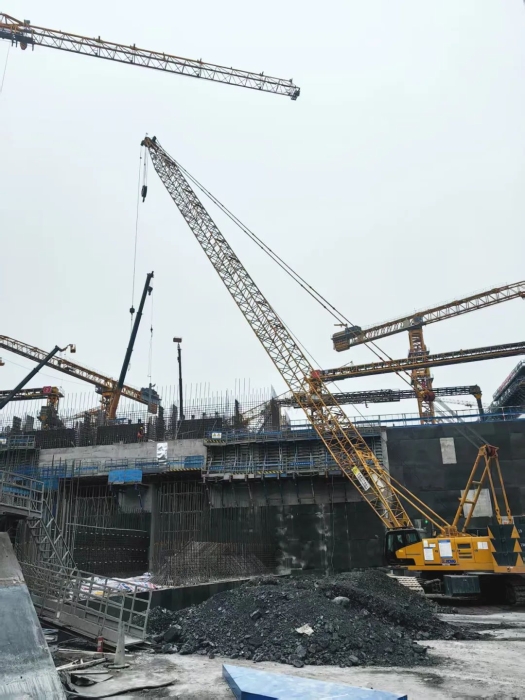 近日 红桃影视,徐工XGC110A(110吨级)履带式起重机在广西设备密集度很高的运河枢纽施工现场大显身手。