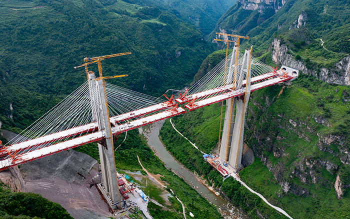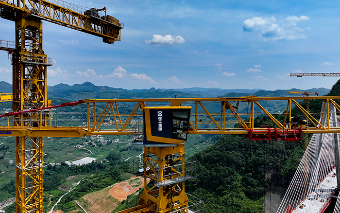 在黔中腹地悬崖峭壁间的乌长高速公路金旗特大桥项目上,徐工群塔与施工升降机协同作业,助力世界最高深山峡谷连体斜拉桥建设。