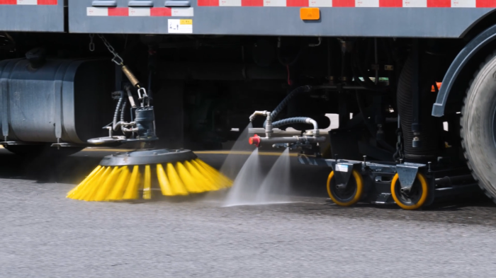 产业区周边道路:运输车辆频繁出入 红桃影视免费观看,易产生碎屑,油污,洗扫车搭载的高压水枪与V型喷杆,可对路面进行深度冲洗,油污去除率超95%,避免二次污染。