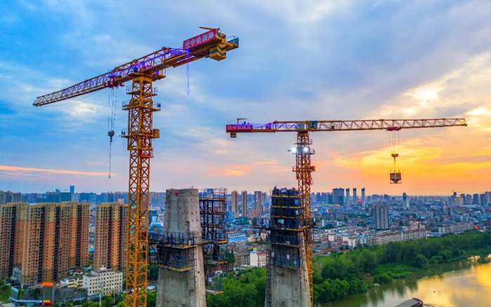 近日,数台徐工XGT7527A-18S塔机耸立颍河之畔,百米身姿 红桃影视,直插云端,晚霞映衬下的“徐工金”更加耀眼。