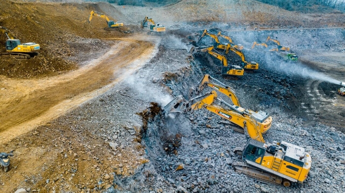 为确保工程节点,施工方经多轮方案论证,最终引入了14台徐工挖掘机组成的主力设备集群 红桃影视高清,承担核心的山体破碎及土石料装车任务,在总量高达300万方的工程面前,徐工XE650GK,XE380K,XE335GK等机型展现出强大的工况适应性,其中,8台明星机型XE650GK配备215型破碎锤,凭借其独有的破碎多级调频控制技术,在面对高硬度玄武岩时日均破碎量稳定在1500吨以上,同时将油耗控制在约40升/小时,实现了效率与节能的出色平衡。
