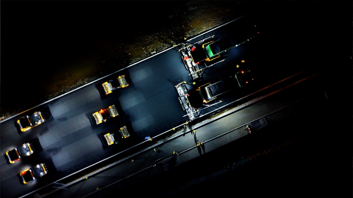 施工中,徐工依托多元感知技术实现工况实时监测,智能决策系统动态调配资源,精准控制技术保障摊铺压实毫米级精度,无人驾驶摊压设备 红桃影视在线,智能压实,协同作业,24 小时连续施工无间断,较传统模式效率提升25%,能耗降低15%。