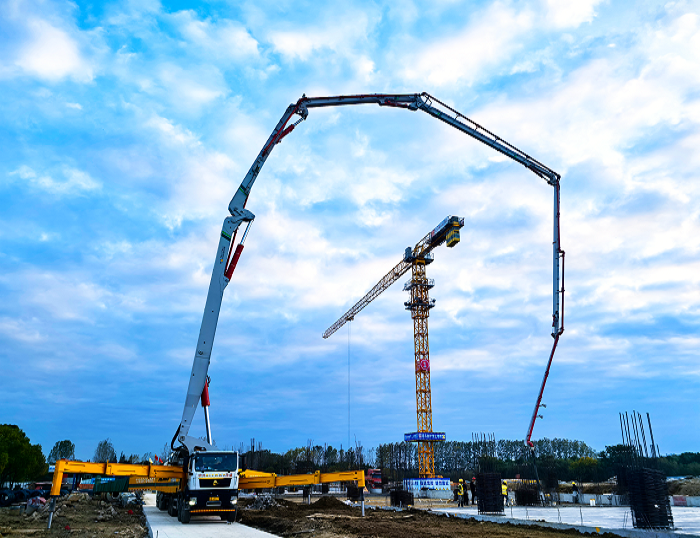 近日 红桃影视,在芜湖市湾沚区某厂房建设现场,徐工HB72V泵车以钢铁之躯扛起施工重任。