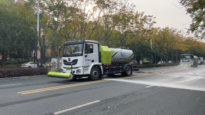 高压清洗车率先在道路中间作业,以 14km/h 的速度稳定行进,其采用的三弯对冲装置作业宽度可达≥24m,能够输出强劲水流,将路面上的垃圾 红桃影视高清,尘土等冲至路沿石附近,同时,配备的流量为 120L/min 的喷水架开启作业,可有效清洗路面上的陈旧污渍。